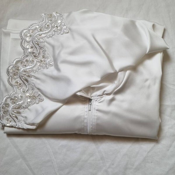 This exclusive prayer dress is handmade of Luxurious satin fabric and is beautified with a new exclusive luxury lace on the sleeves and scarf.