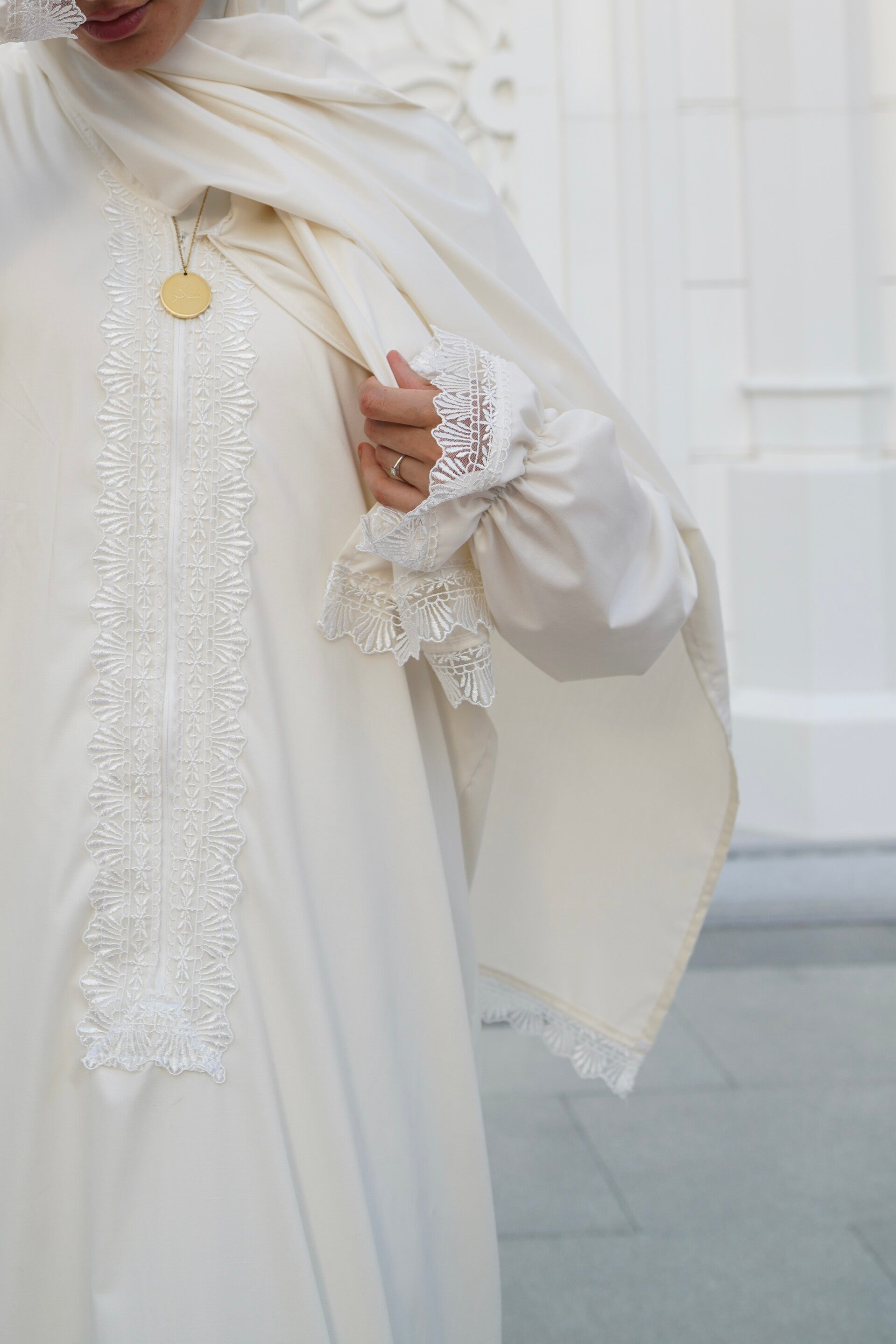 4. Included Matching Hijaab: The dress comes with a partly attached matching hijaab, as shown in the picture. The hijaab is approximately 180 cm long, providing versatility for different styles of wearing.